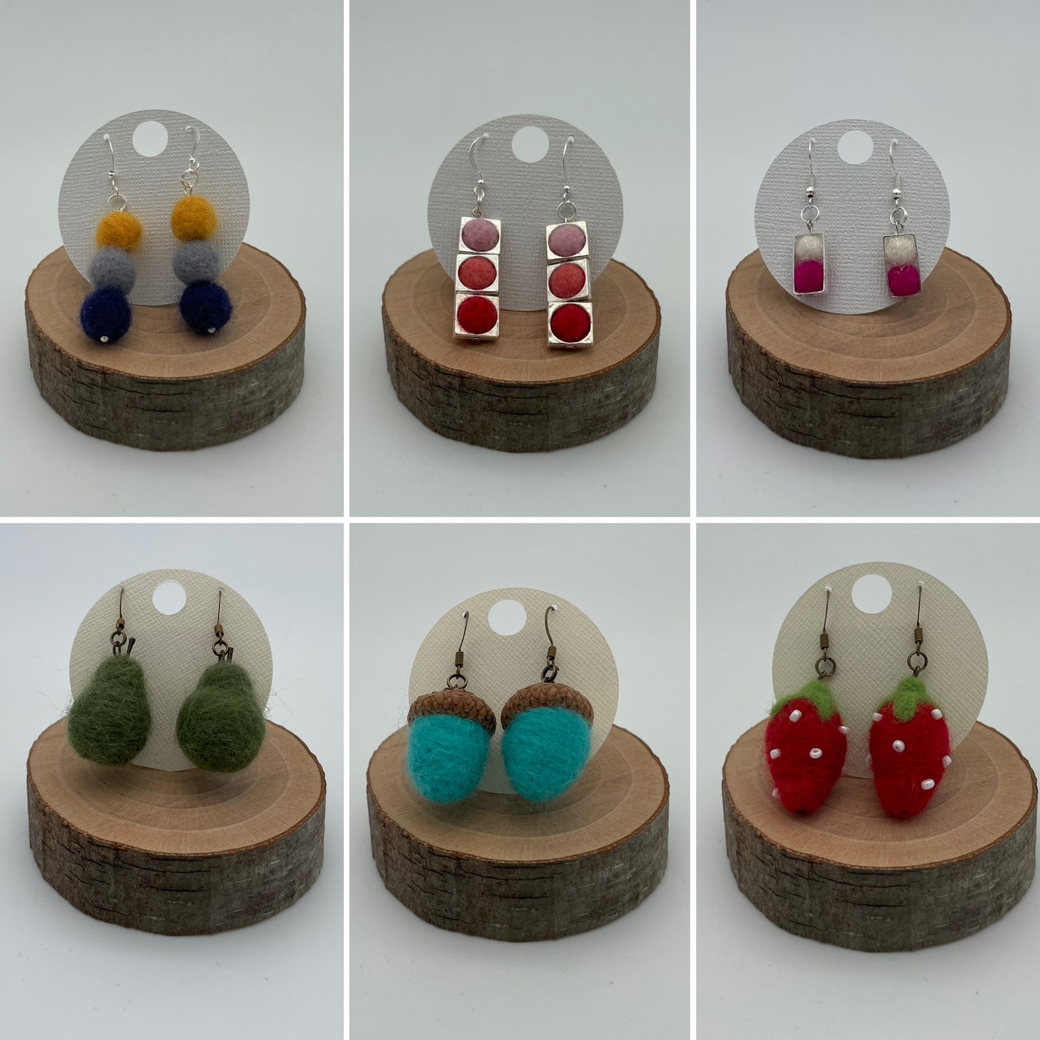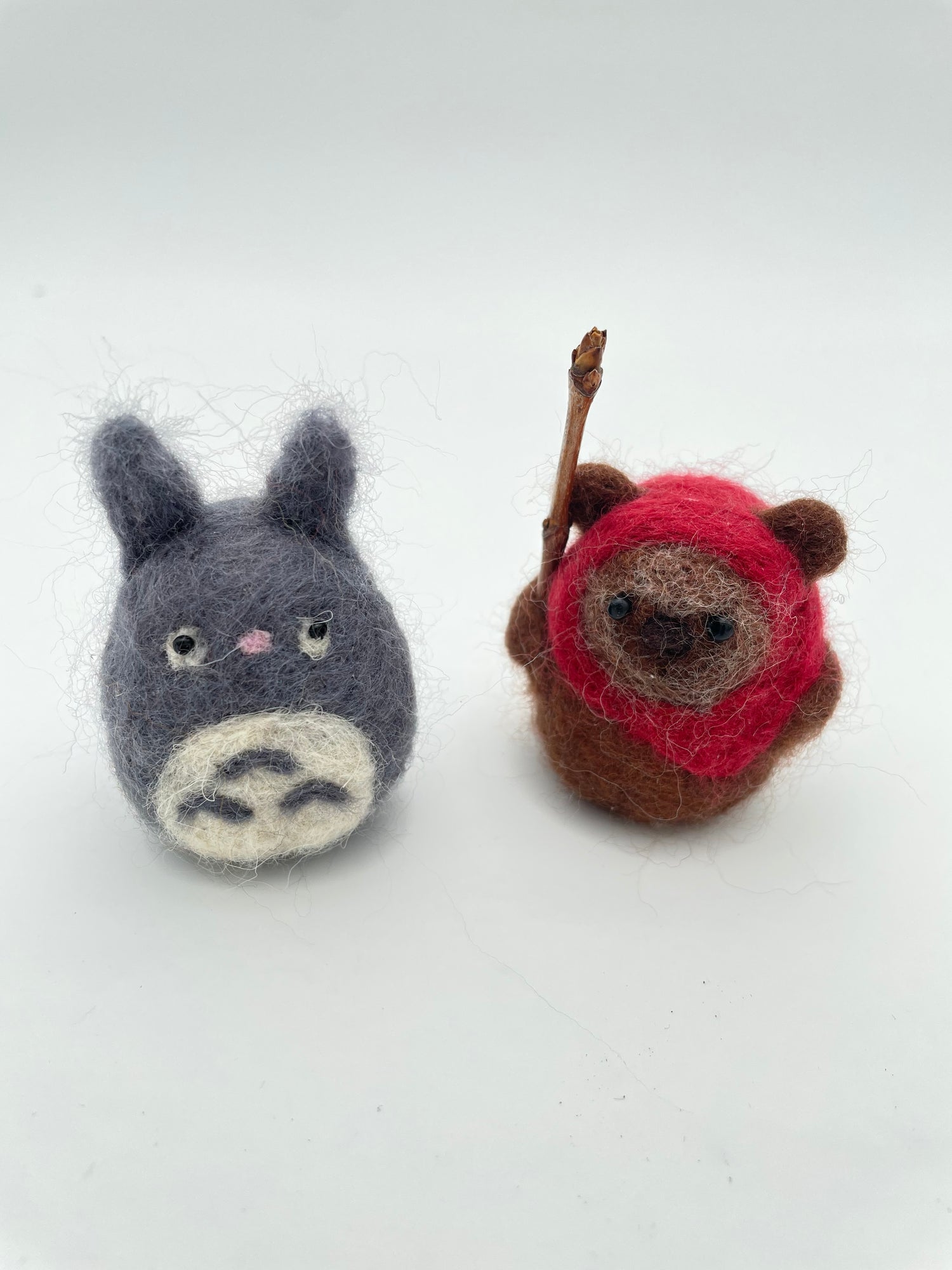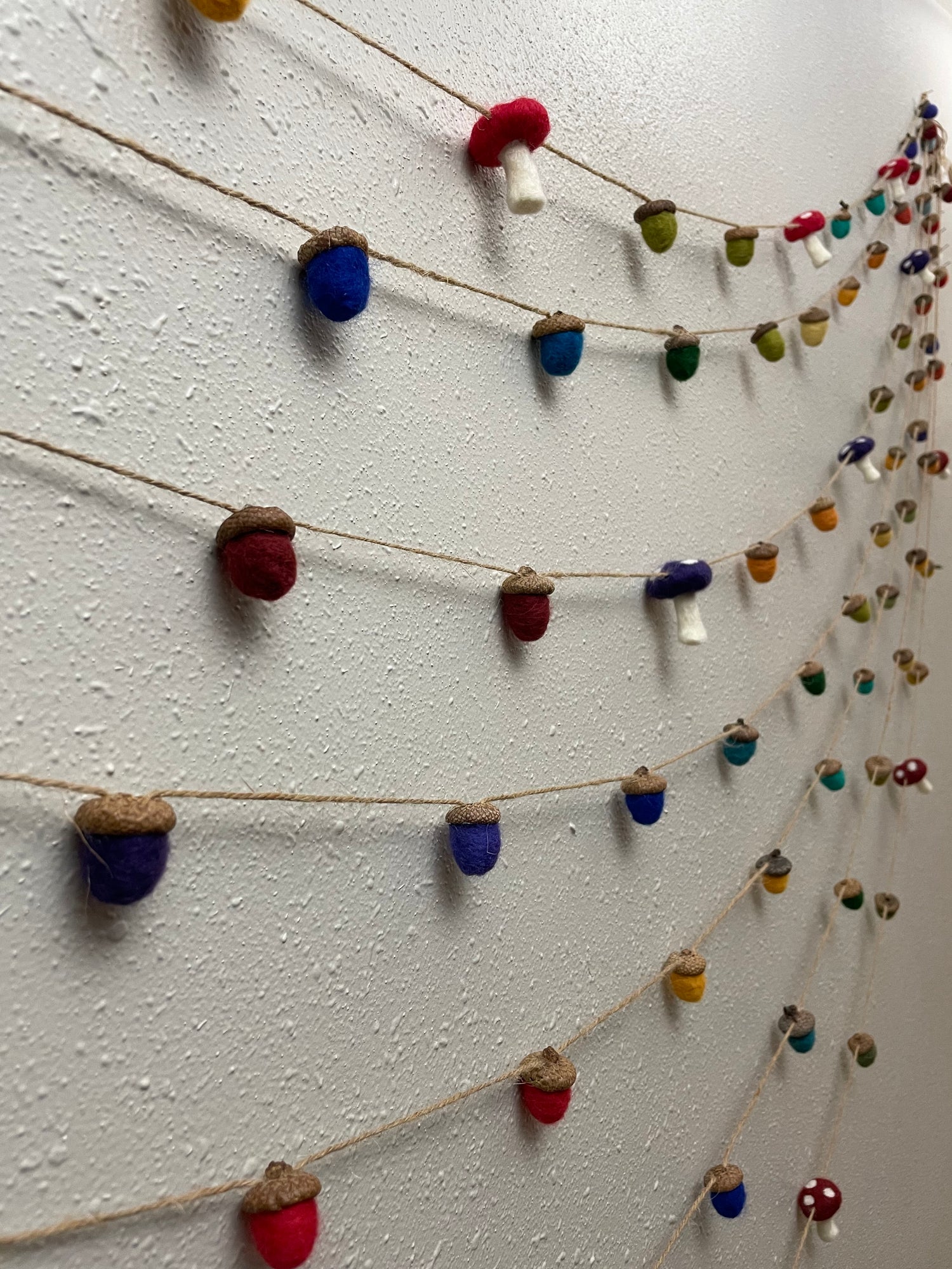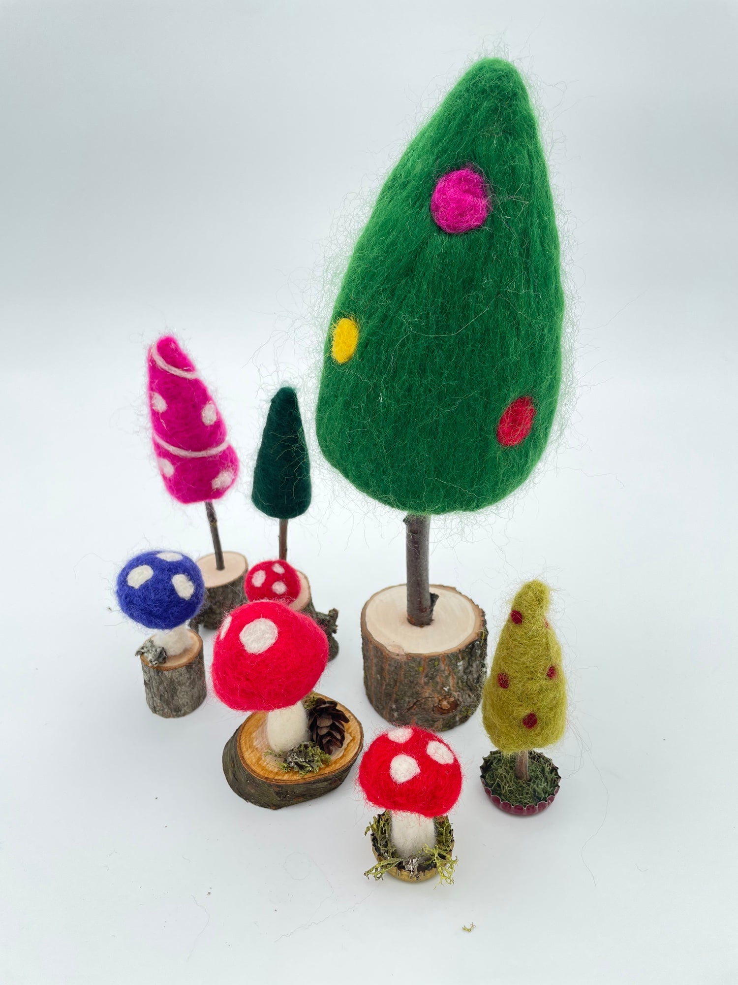 Hand-crafted, felted mushrooms and trees for fun decor and seasonal forest settings.