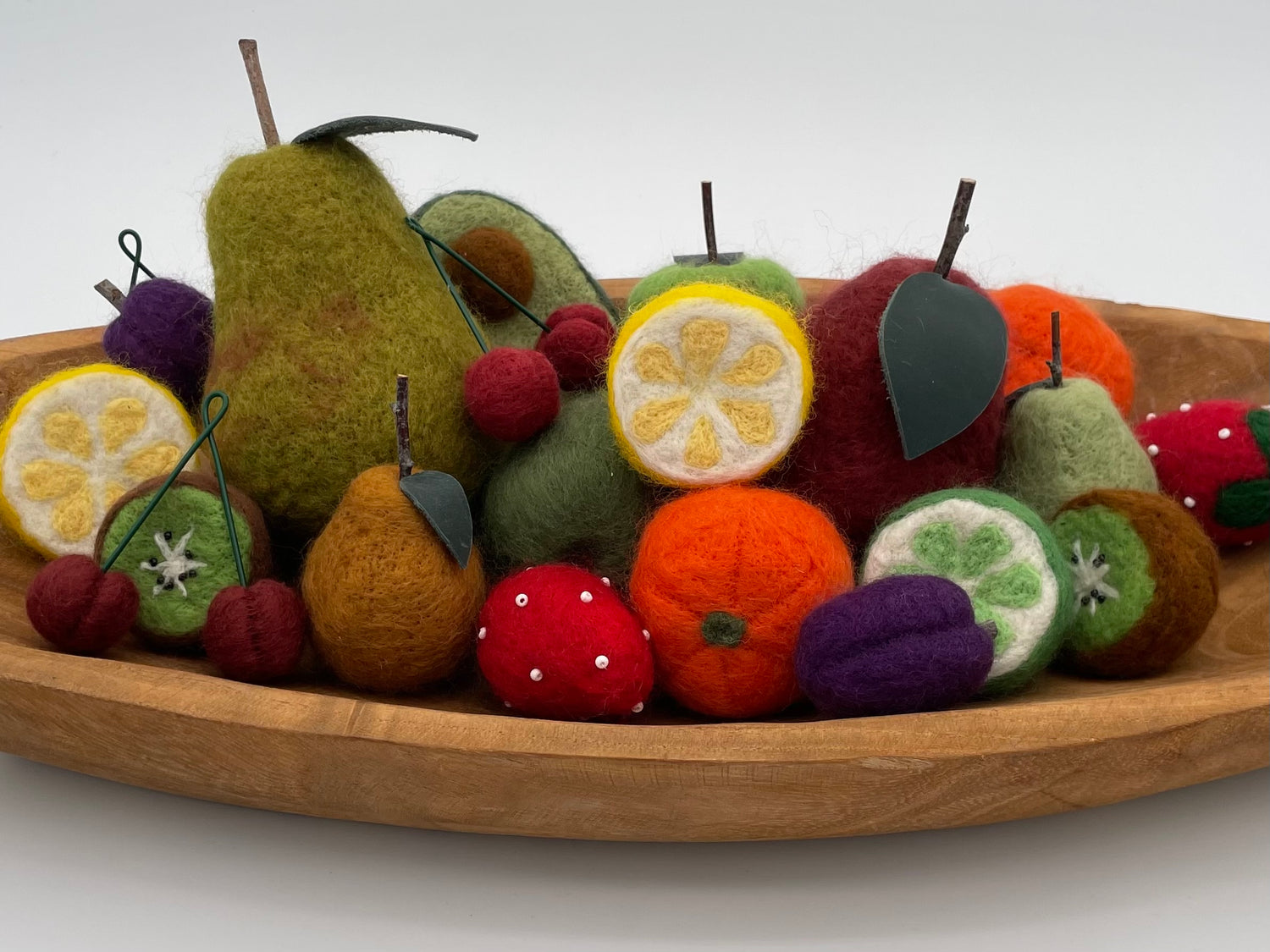 Felted, hand-crafted fruits and veggies for fun and decoration.