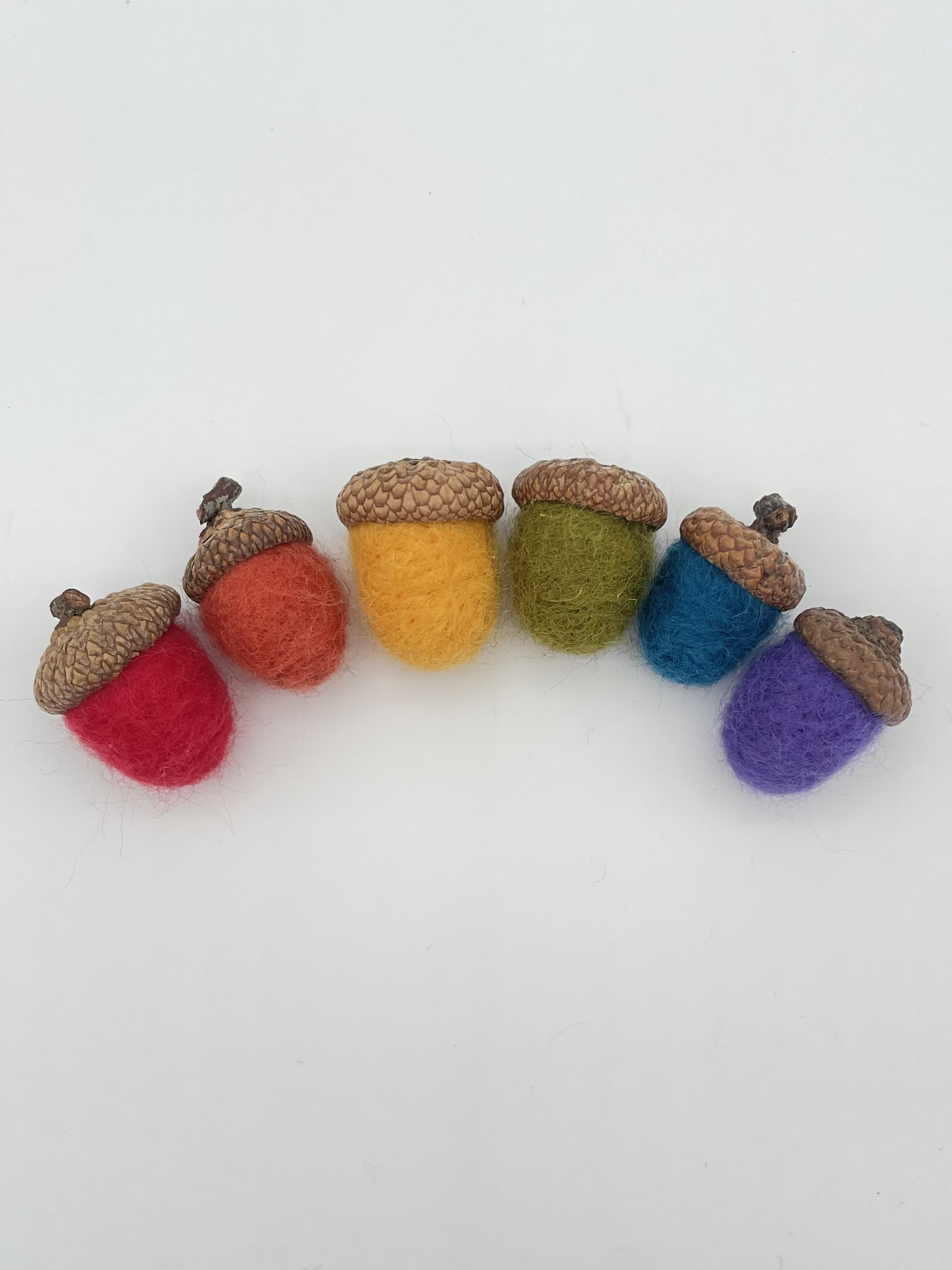 Hand-crafted, felted wool acorns with naturally-sourced acorn caps. Approx. 3/4"-1".