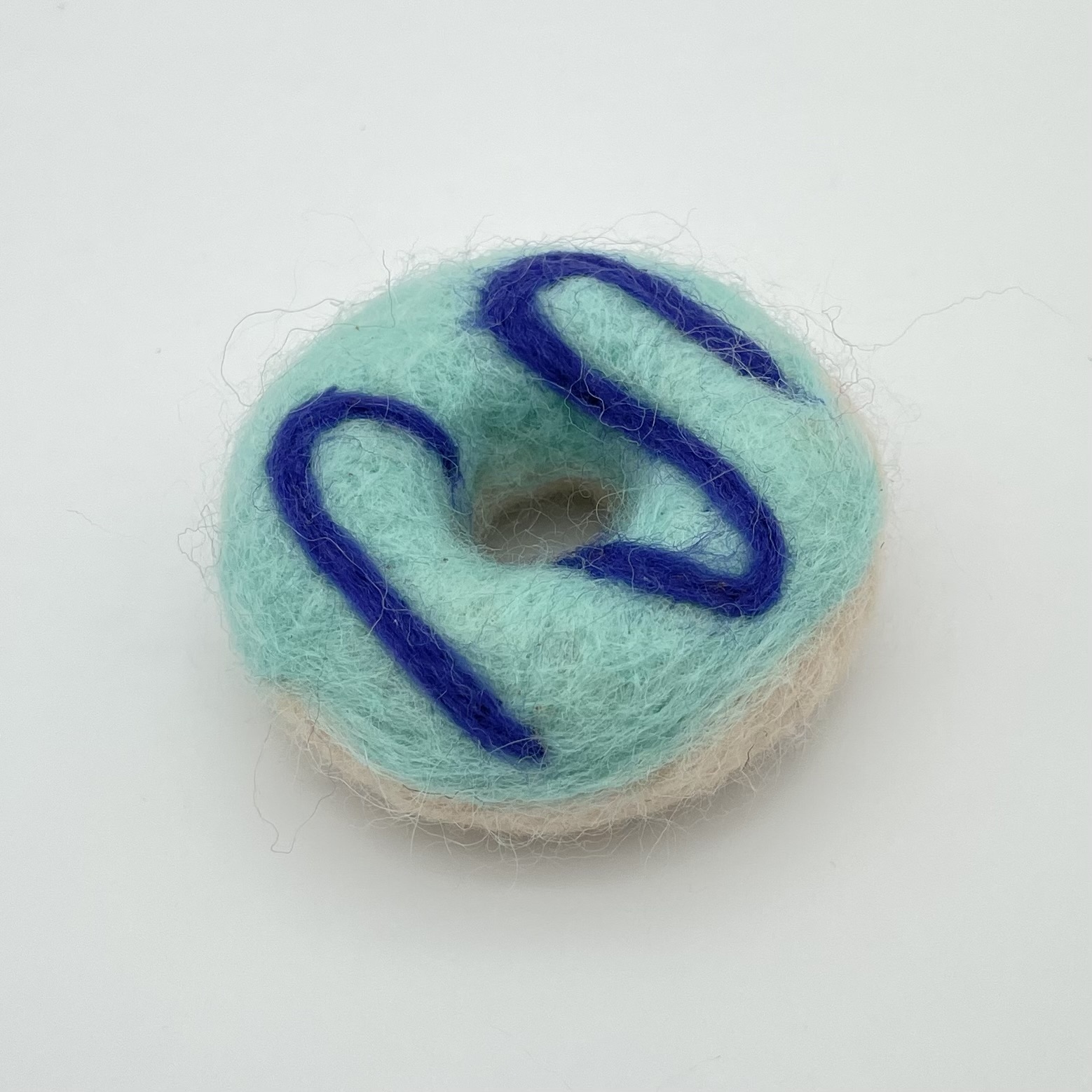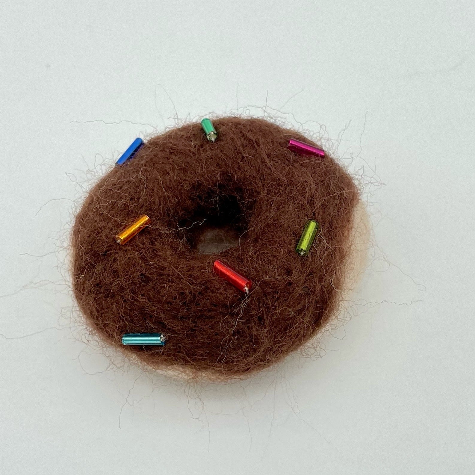 Hand-made, felted wool donut with glass bead sprinkles or glitter wool swirl. Approx. 2" x 2". Please note, this is not intended as a toy.