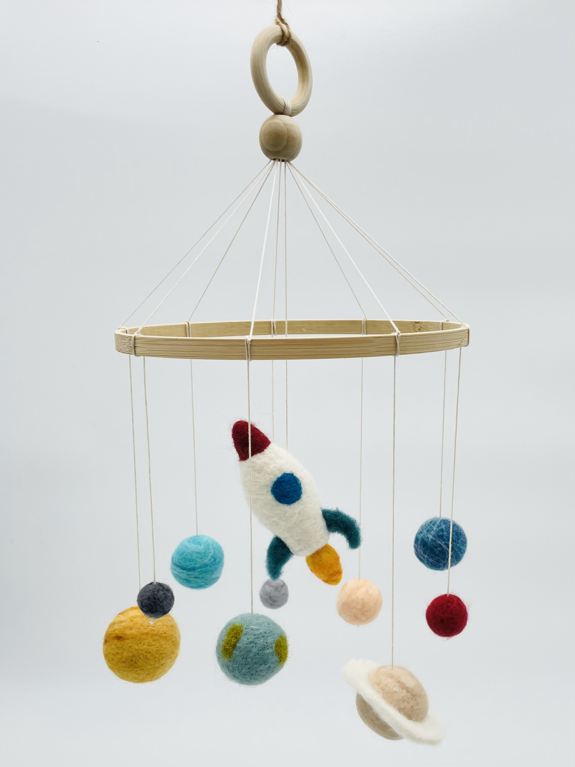 Hand-crafted, keepsake mobile with nine felted wool planets and rocket, bamboo hoop, and wooden ring for hanging.