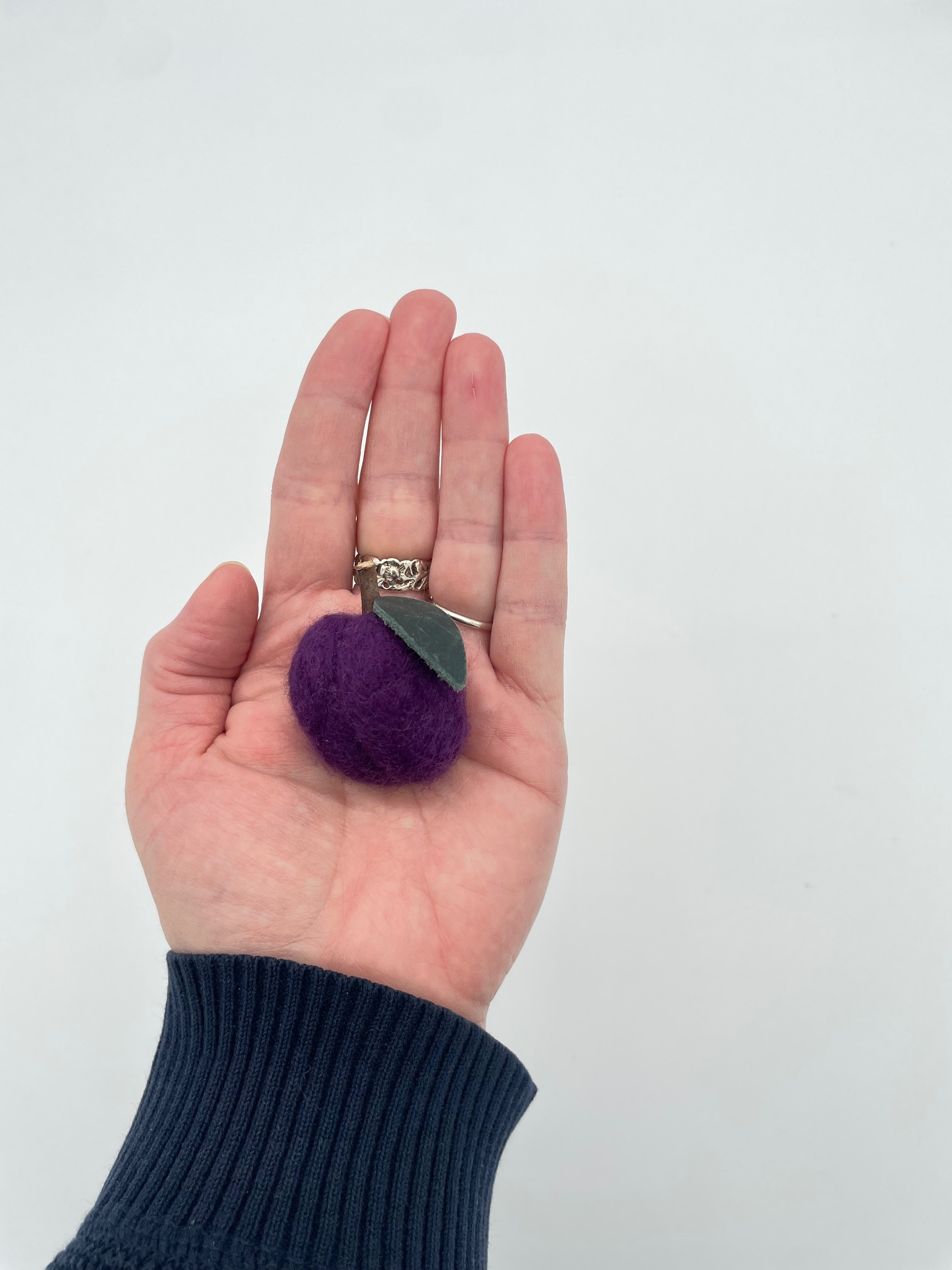 Hand-crafted, felted wool plum with natural twig stem and leather leaf. Please note, this is not intended as a toy. Approximately 1.25" x 1.75".