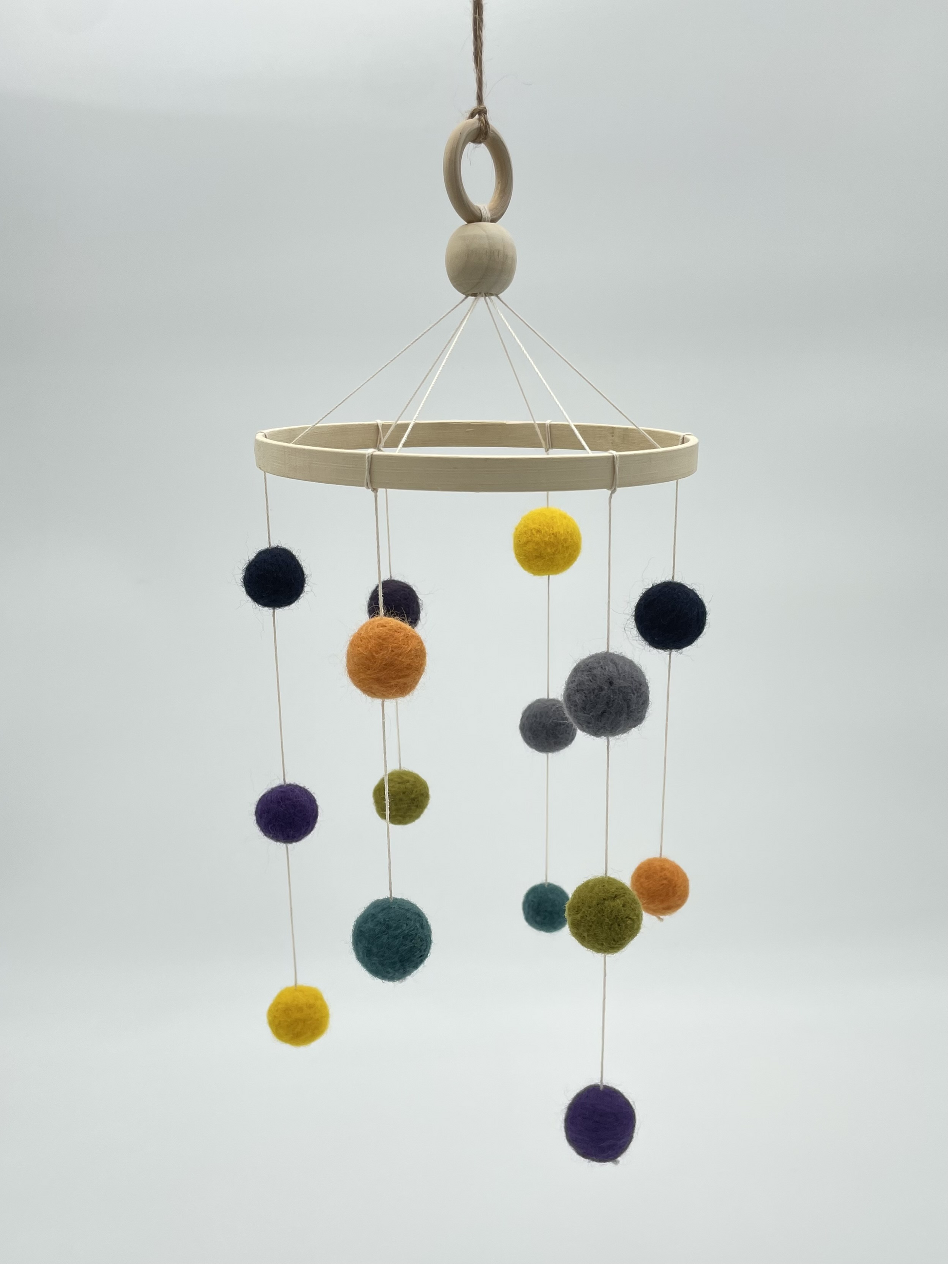Hand-crafted, keepsake mobile with hand-felted wool dots, bamboo hoop, and wooden ring for hanging.